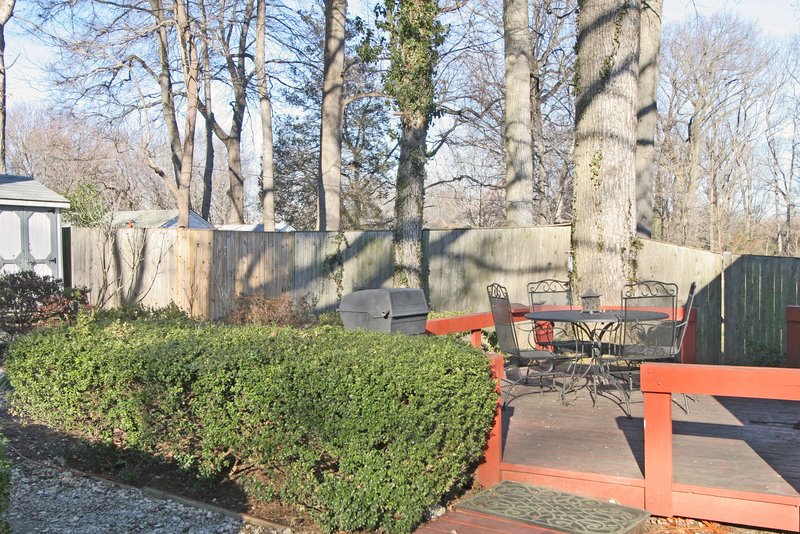 the various distinct patio areas in the private fenced